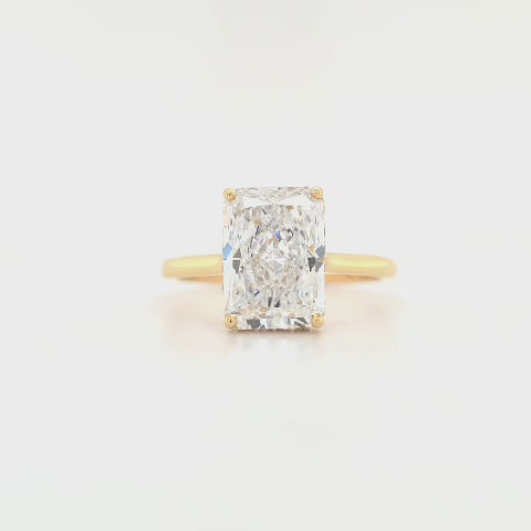 A sophisticated statement of elegance, this radiant-cut solitaire engagement ring features a 3.13ct lab-grown diamond centre, enhanced with a hidden halo and cathedral-style band for refined brilliance and presence.